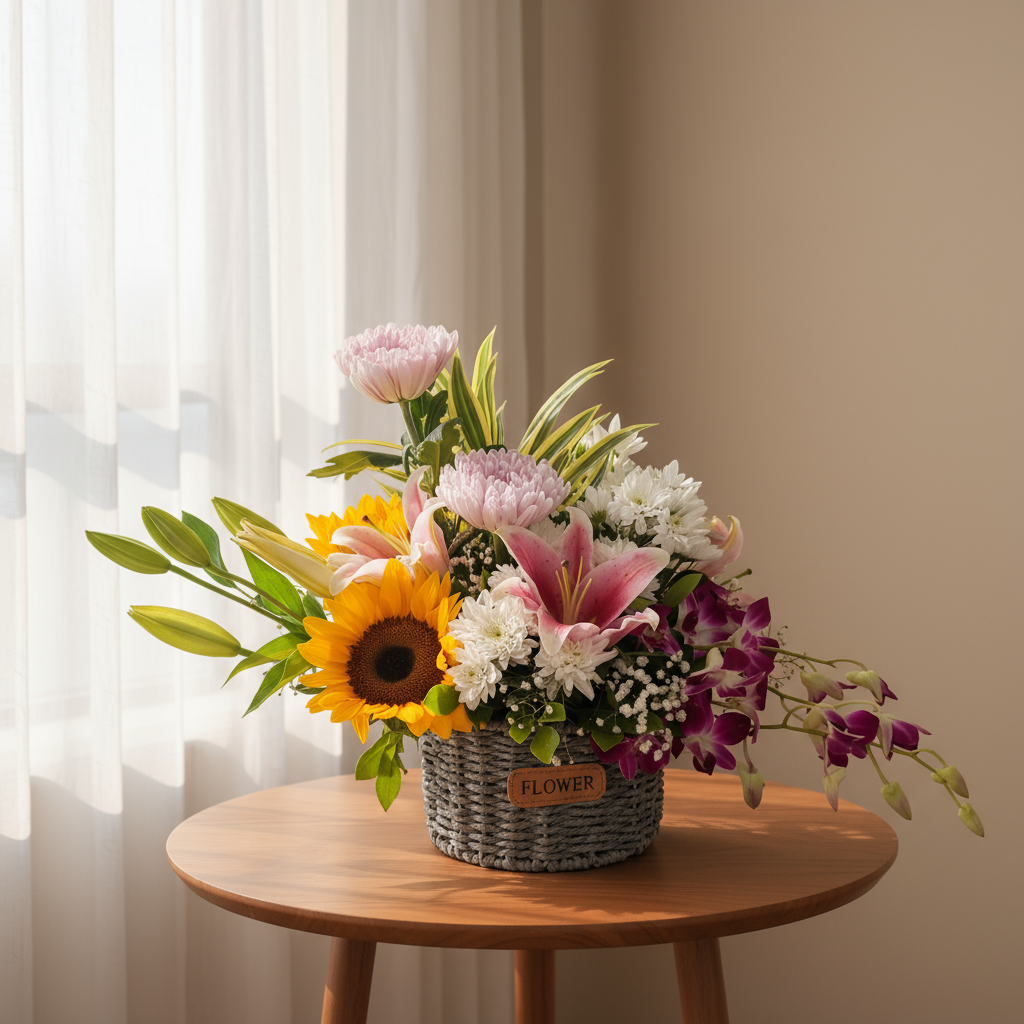 A radiant basket arrangement featuring sunflowers, soft pink lilies, chrysanthemums, baby’s breath, pink disbuds, and purple orchids. This piece blends freshness, color, and elegance.
