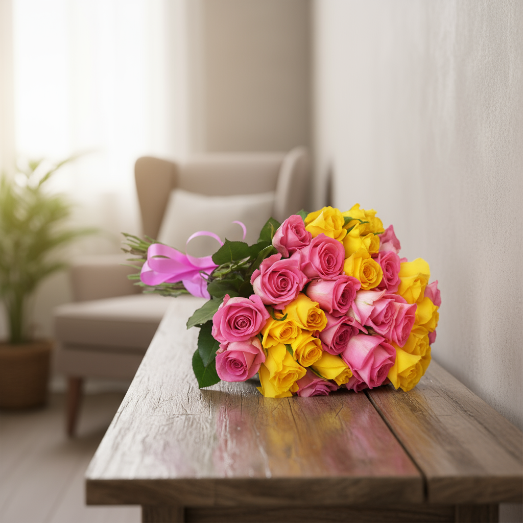 A bright hand bunch of 30 Yellow and Pink roses, tied with Pink Ribbon!