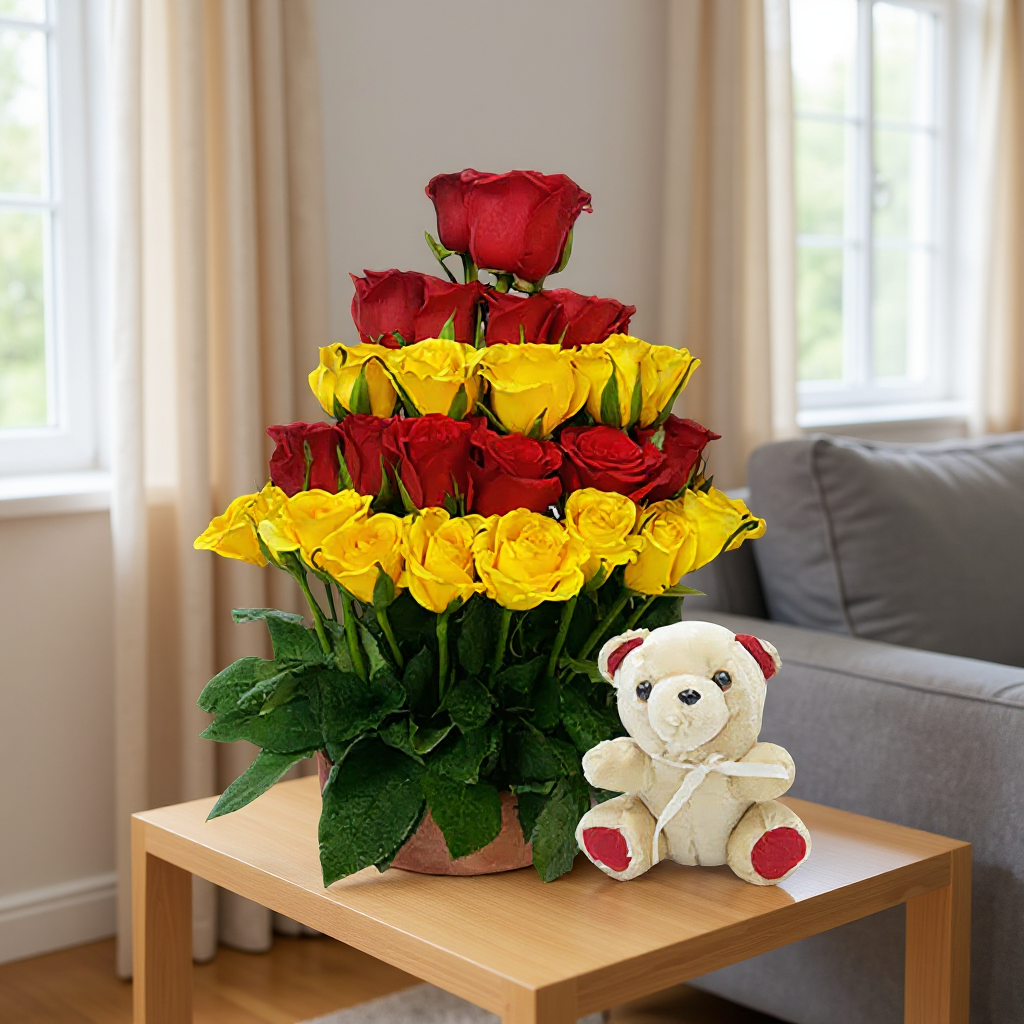 Fresh 25 Red and Yellow Roses arranged in a beautiful manner with a cute teddy!