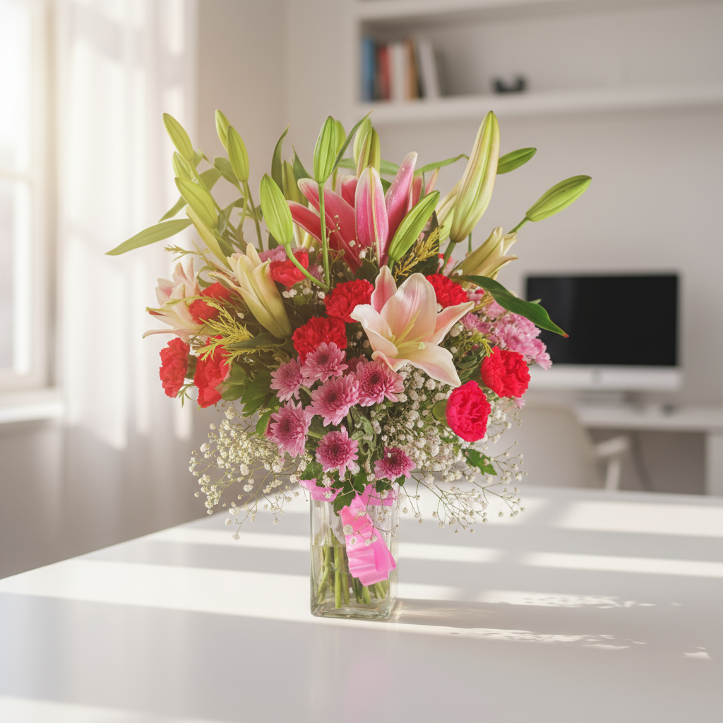 A large floral arrangement of gorgeous pink blossoms with Oriental lilies, carnations and chrysanthemums in a glass vase.  A must for Special occasion gifting. Order today