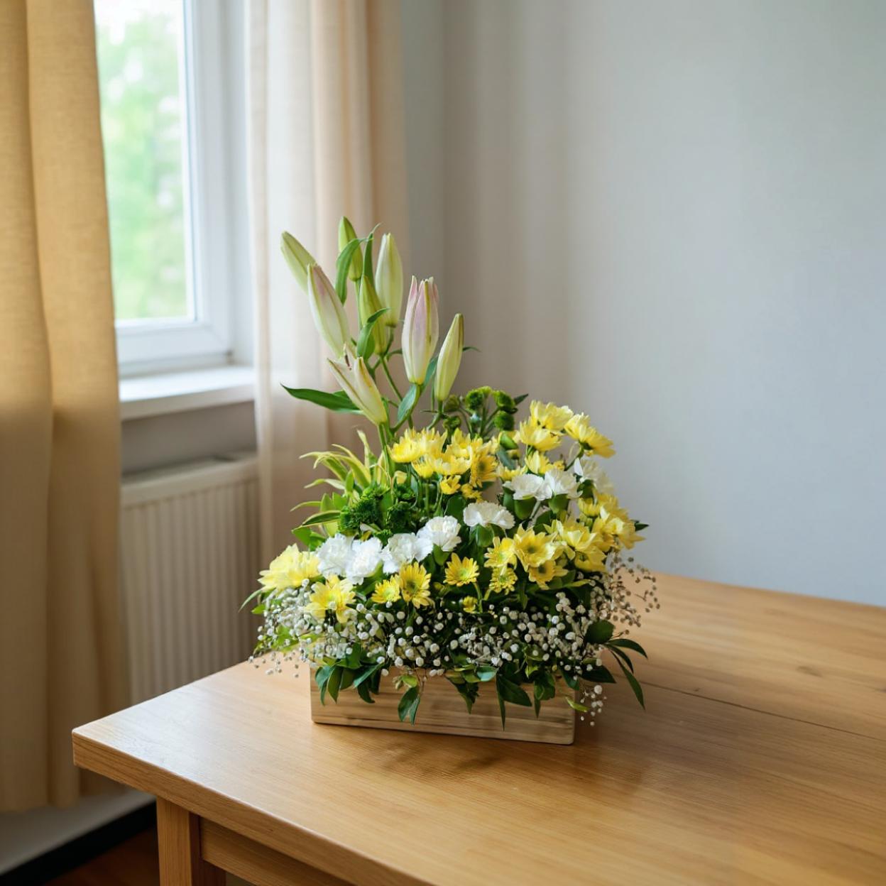A bright yet soothing arrangement of 1-2 lilies and 2-3 cheerful yellow chrysanthemums and 6-8 white carnations anchored in a minimal wooden box.