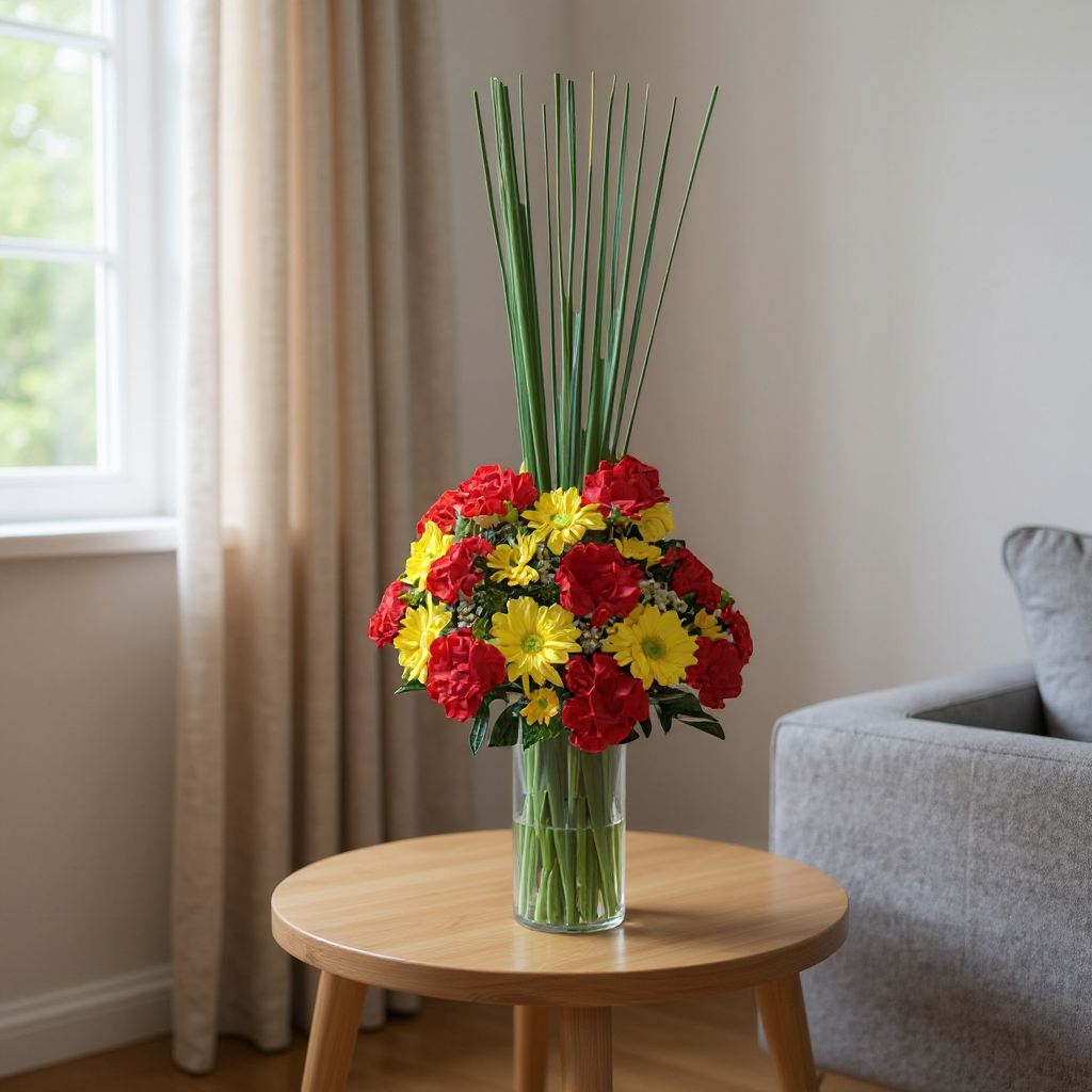 This festive arrangement of 12 Carnations and 7 Chrysanthemums in a glass vase is the perfect gift for any celebrations!