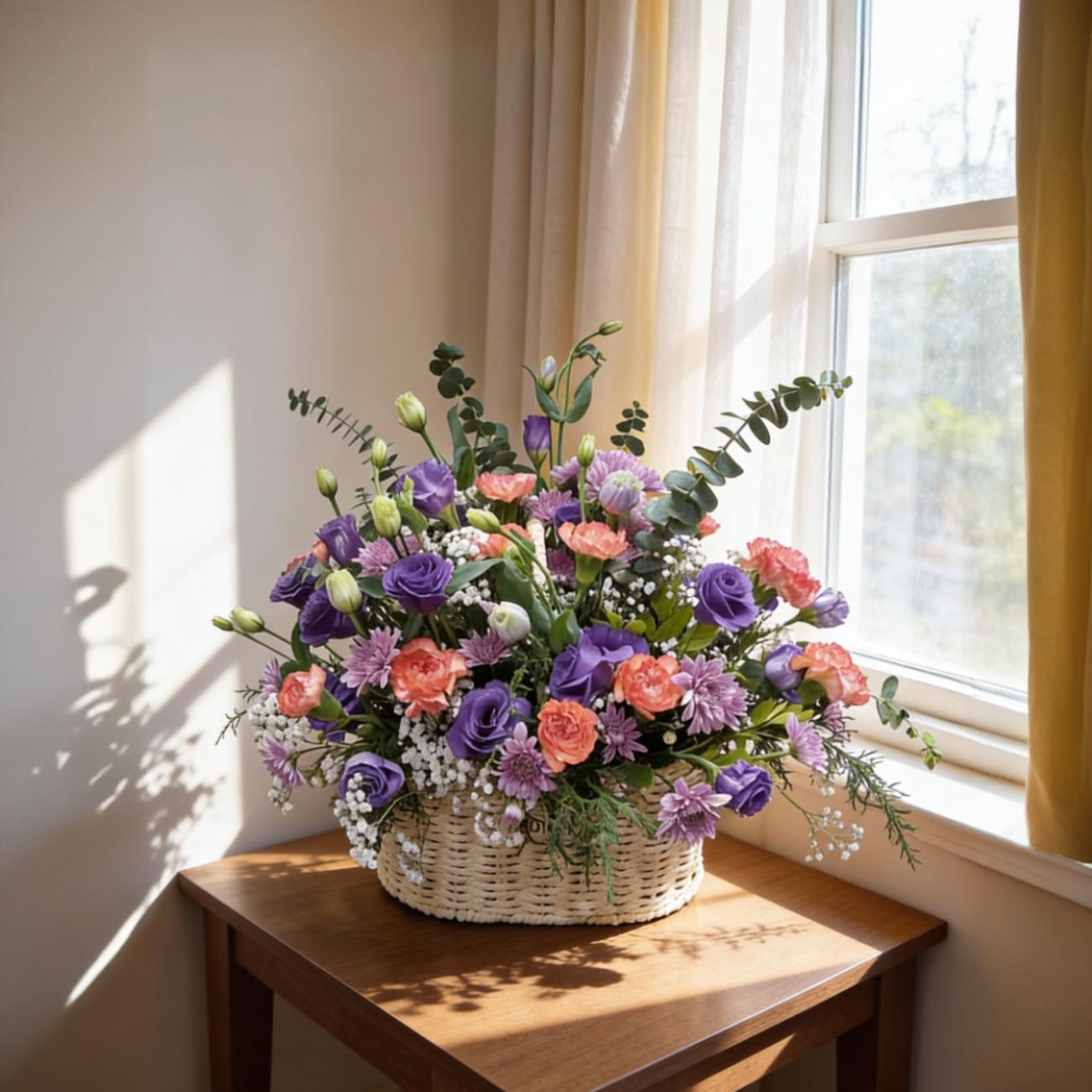 A charming floral basket showcasing elegant 3-4 purple eustomas, 6-8 soft peach carnations, 2-3 lavender chrysanthemums, baby’s breath, and 3-4 eucalyptus foliage, thoughtfully arranged to capture the romance of a blooming garden.