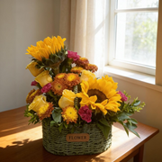 A joyful floral basket featuring 2 radiant sunflowers paired with 3-5 roses and 2-3 chrysanthemums, artfully arranged to express happiness and positivity.