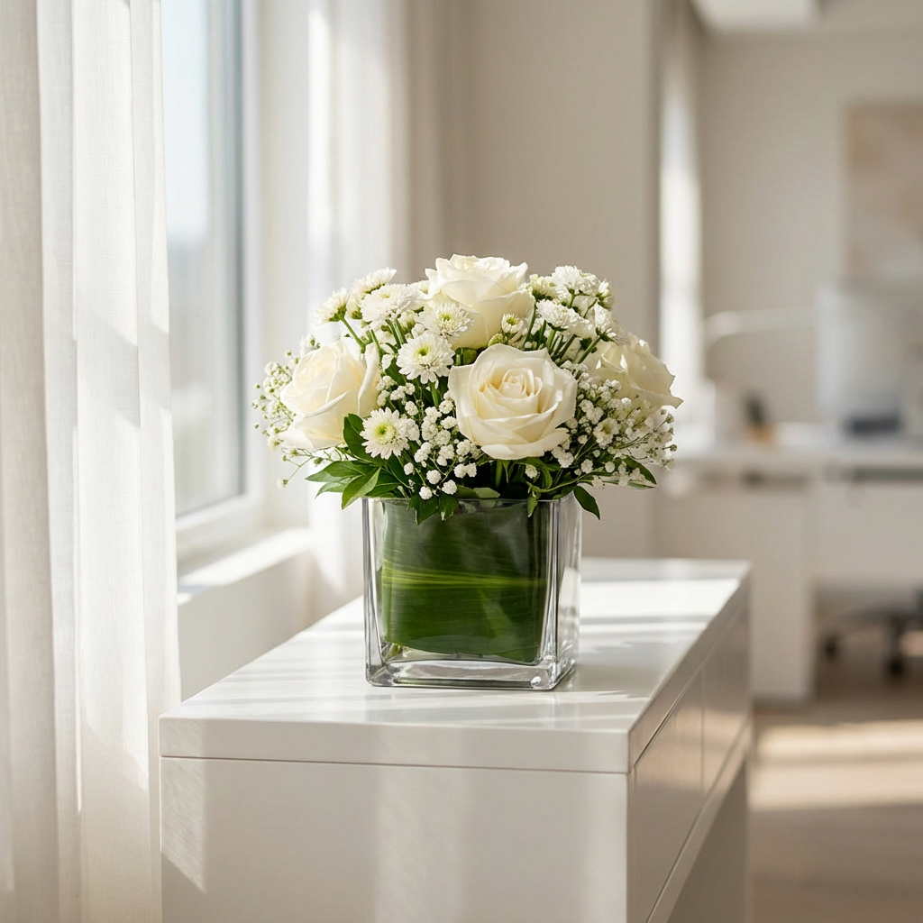 A bright and fresh square vase arrangement featuring 3-5 yellow roses, 2-4 chrysanthemums, and 2-3 green button chrysanthemums, radiating cheer and positivity.