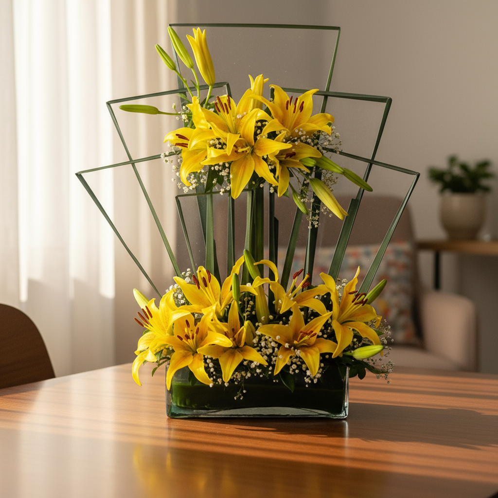 Arrangement of 8 stems of yellow lilies & ramban in an elegant glass base.