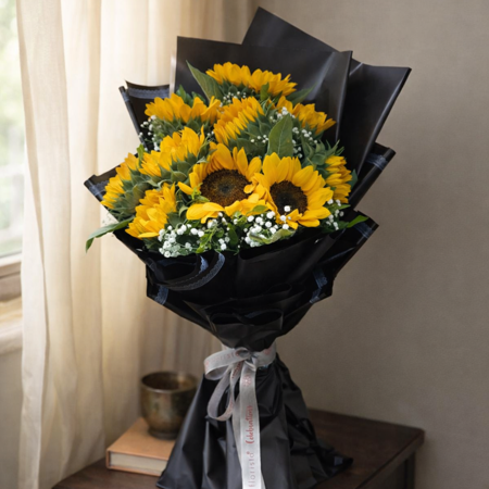 A gorgeous bunch of 10 sun flowers wrapped in a gorgeous paper and tied with a ribbon bow.