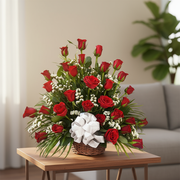 A happy basket of 30 stems of red roses with a big white bow. Send someone happiness today.
