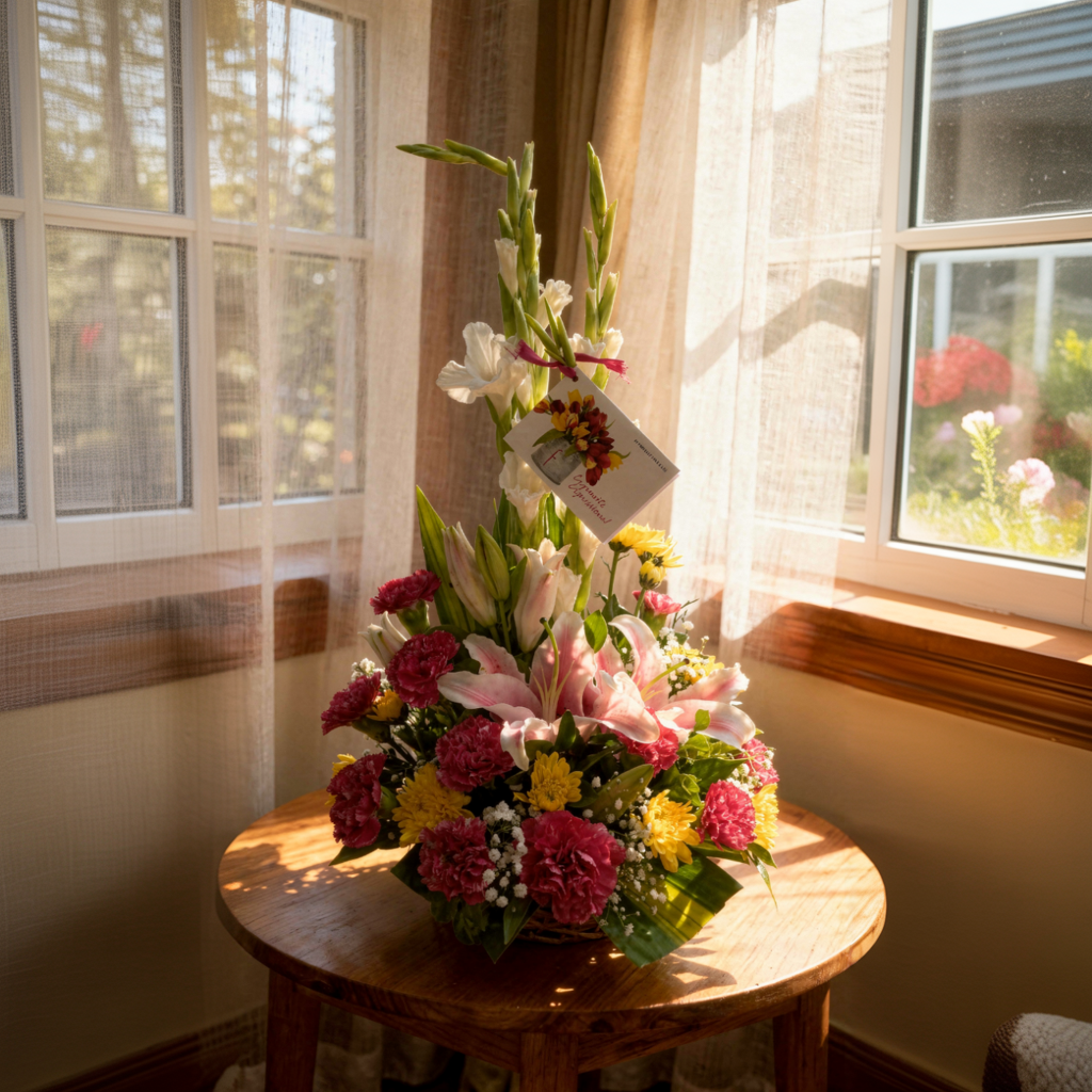 An elegant floral arrangement featuring a stem of lilies, 6-8 carnations, 1-2 chrysanthemums, 2 stems of Gladiolus to create a graceful statement of admiration and warmth