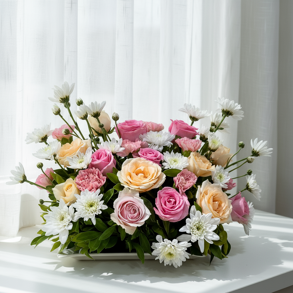This arrangement radiates soft charm and gentle grace featuring 10-12 combination of peach, blush pink, and white roses, 4-5 carnations, and 2-3 chrysanthemums, beautifully composed in a white base. It feels like a breeze of calm joy and tenderness.