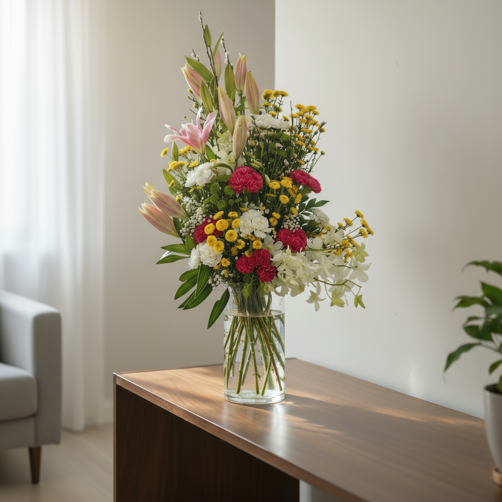 This arrangement is playful yet elegant, mixing pink lilies, 3-4 yellow button chrysanthemums, white orchids, and red carnations in a glass vase.