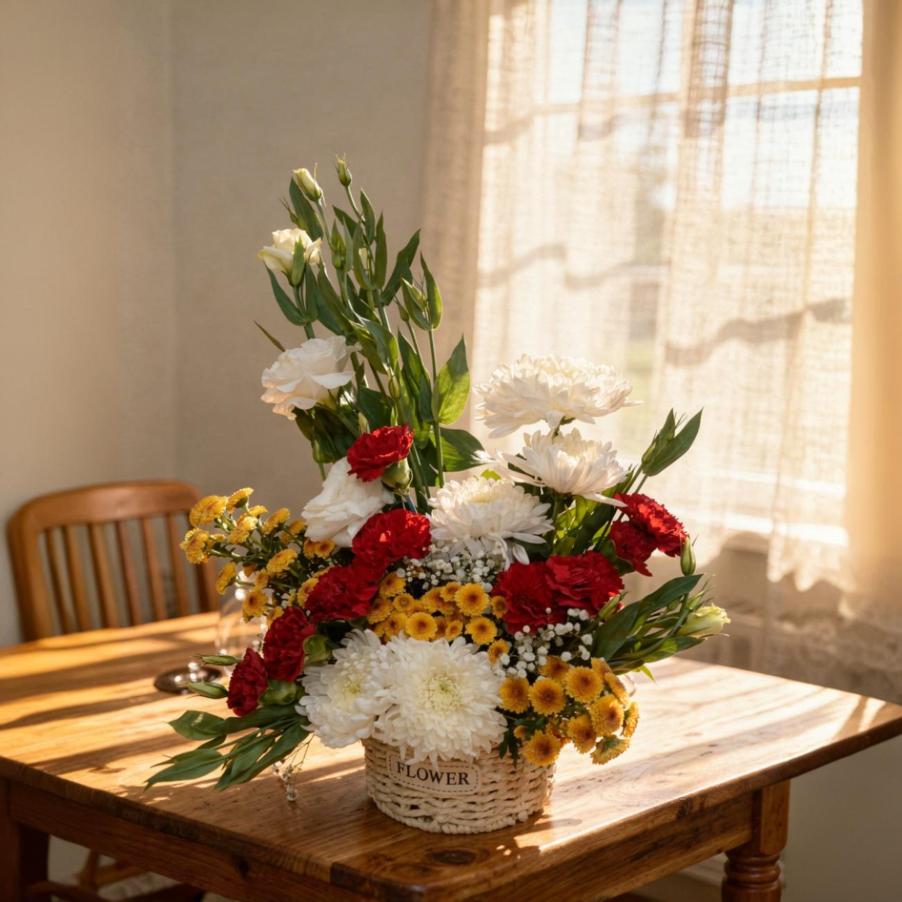 A graceful basket arrangement of 5 white chrysanthemums, 6-8 red carnations, 2-3 yellow button chrysanthemums and 1-2 white eustoma accented with lush greens to convey warmth and admiration.