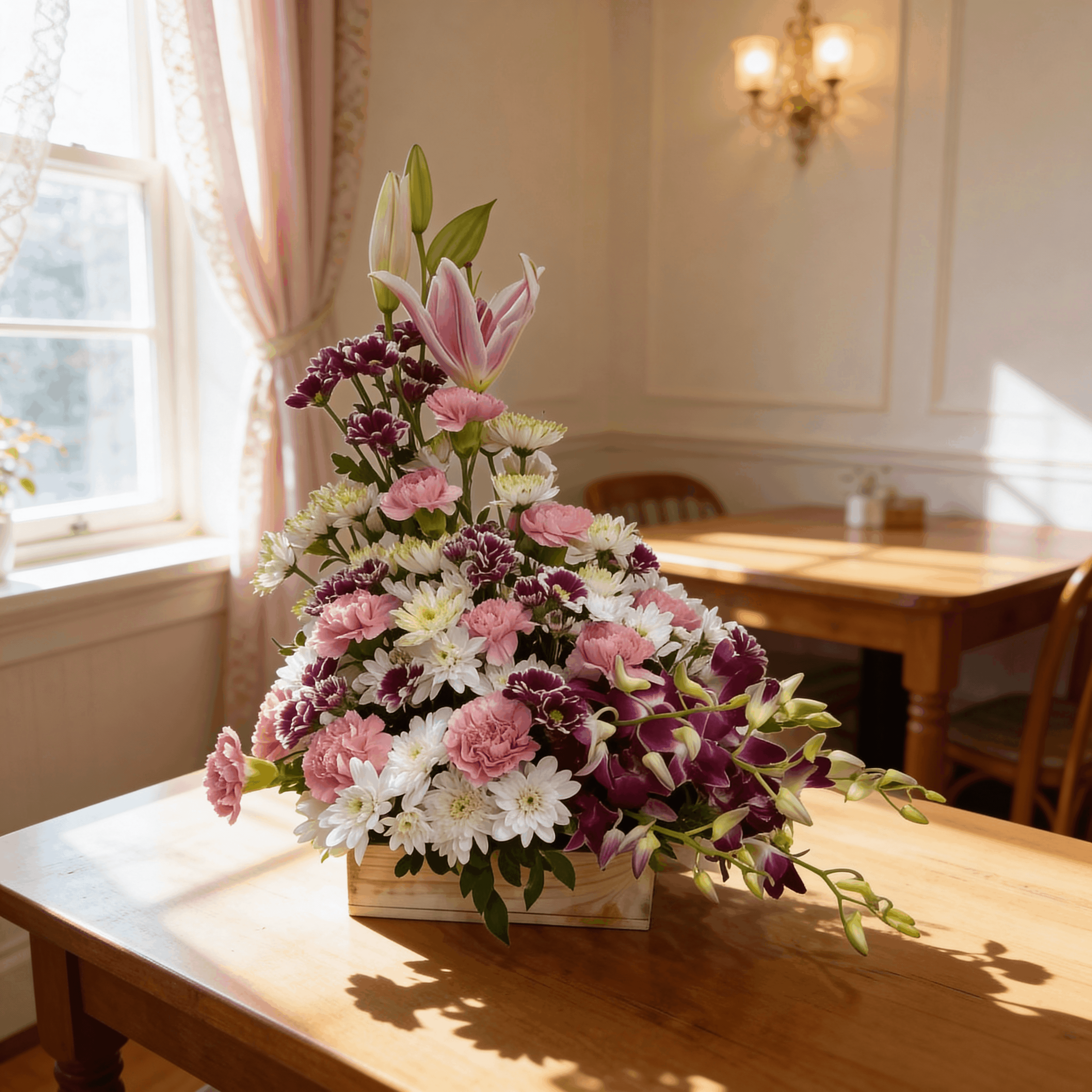 A refined wooden-box arrangement of 1 stem of pink lilies, 6-8 carnations, 2-3 white and purple chrysanthemums, and 5-6 rich purple orchids, thoughtfully composed to express grace and admiration.
