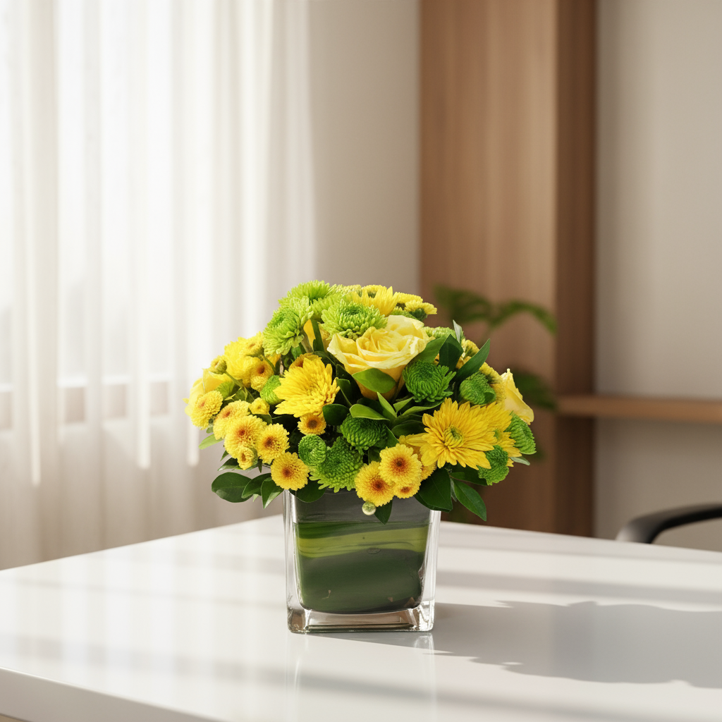 A bright and fresh square vase arrangement featuring 3-5 yellow roses, 2-4 chrysanthemums, and 2-3 green button chrysanthemums, radiating cheer and positivity.