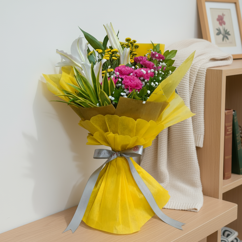 A delightful bouquet that captures the balance of joy and purity, with its blend of 1-2 lilies, 5-7 carnations, and 1-2 cheerful yellows button chrysanthemums with greens.