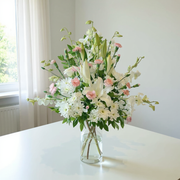 An airy arrangement of 2-3 white lilies, 4-6 carnations, 2-3 white chrysanthemums, and 5-7 orchids, designed in a clear glass vase to evoke calm and purity.