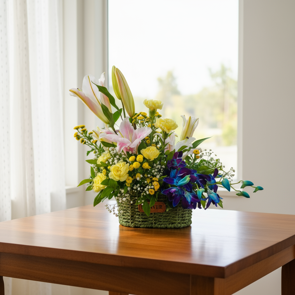 A vibrant basket of 1-2 pink lilies, 5-7 yellow carnations, and 2-3 stems of striking blue orchids, accented with white fillers. This cheerful yet elegant arrangement blends warmth, freshness, and charm, making it perfect for celebrations, admiration, or simply brightening someone’s day.