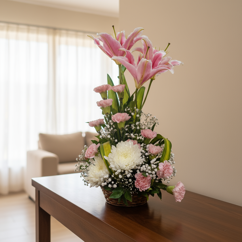 A graceful basket arrangement of a pink lilies, 10-12 carnations, and 1-2 white chrysanthemums soft, fresh, and beautifully refined.