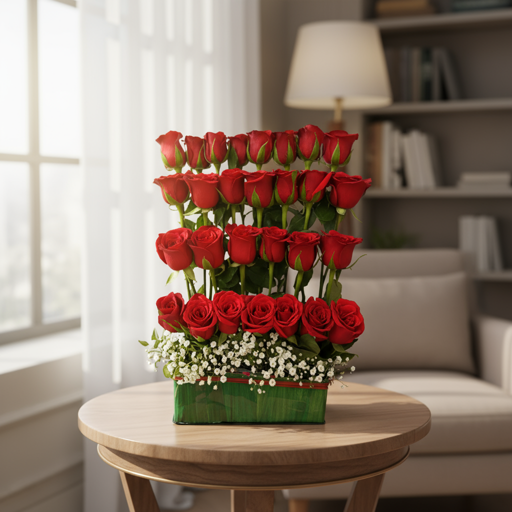 A chic Rose Tower containing 28 Red Roses arranged in perfect rows, packed in a basket with greens and white fillers!