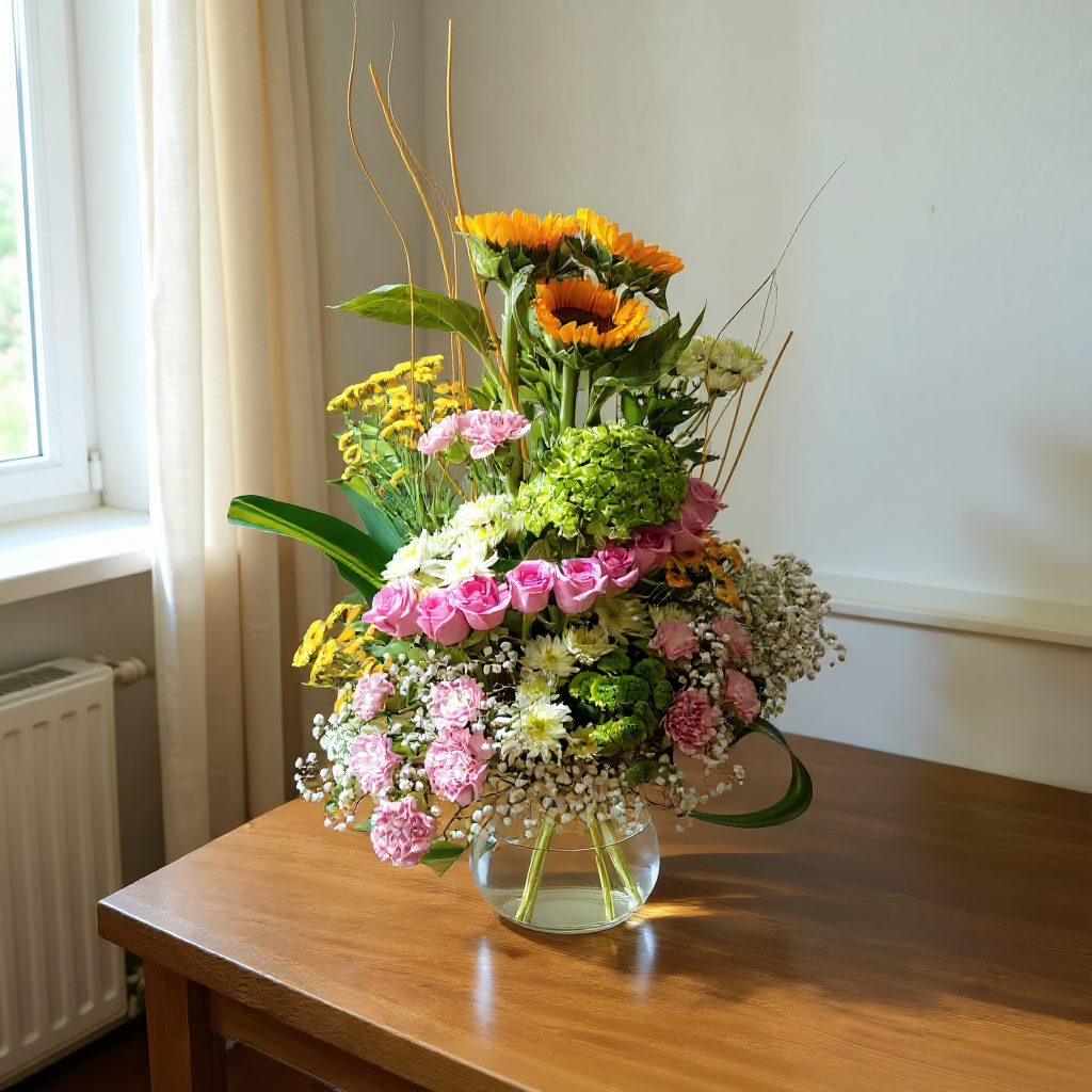 A vibrant floral arrangement of 3 radiant sunflowers, 8-10 pink roses, 8-10 carnations, 1-2 chrysanthemums, and a green hydrangea, thoughtfully styled to celebrate joy, and natural elegance