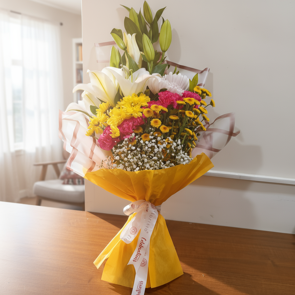 This bouquet radiates joy, positivity, and heartfelt emotion. With 2-3 lilies, 2-3 button chrysanthemums, 5-7 and pink carnations.