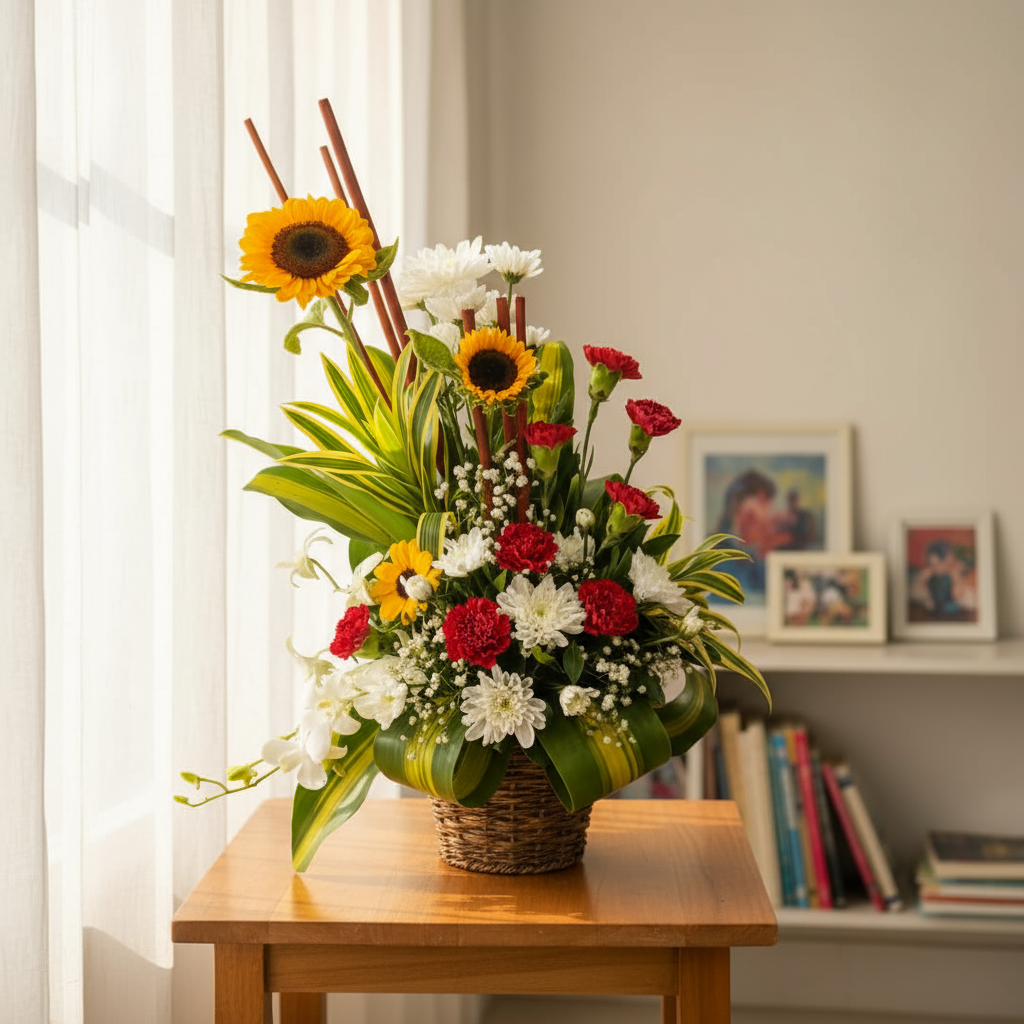 A radiant symphony of 3 sunflowers, 6-8 carnations, 2-3 chrysanthemums, and greens arranged to express joy, vitality, and heartfelt affection.