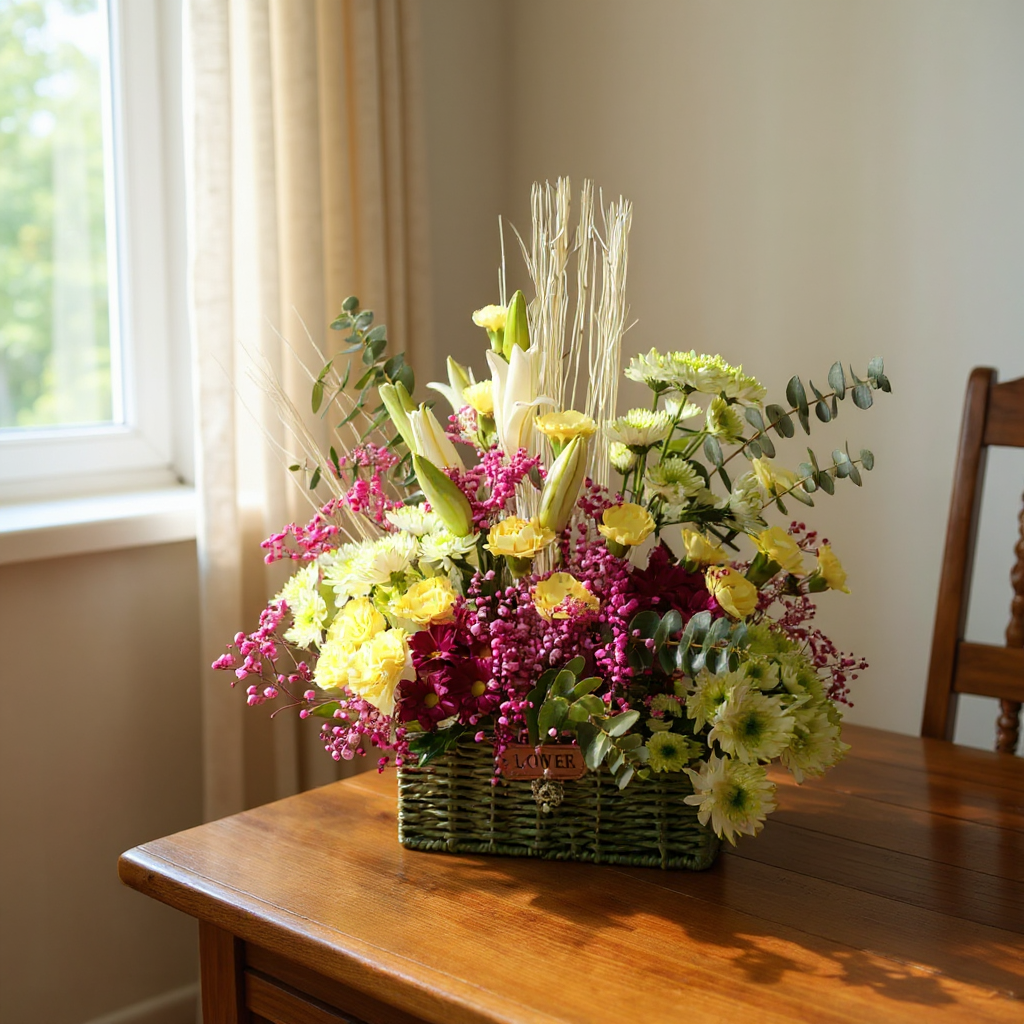 A charming basket arrangement of 10-12 yellow carnations, 1-2 elegant white lilies, 1-2 green chrysanthemums, pink fillers, and 5-7 eucalyptus, woven together to radiate warmth and cheer.